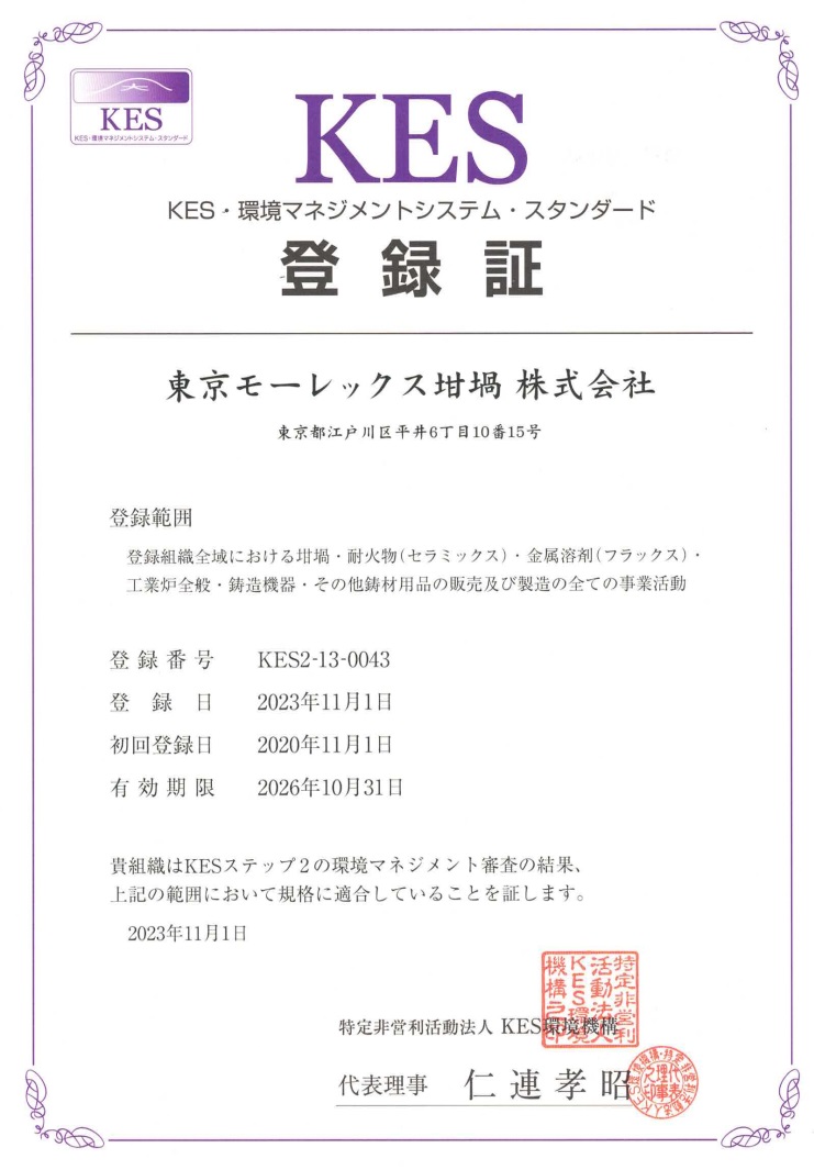 東京モーレックス坩堝株式会社(TOKYO MOREX CRUCIBLE CO., LTD) KES環境マネジメントシステム・スタンダード・ステップ2 認証取得のお知らせ