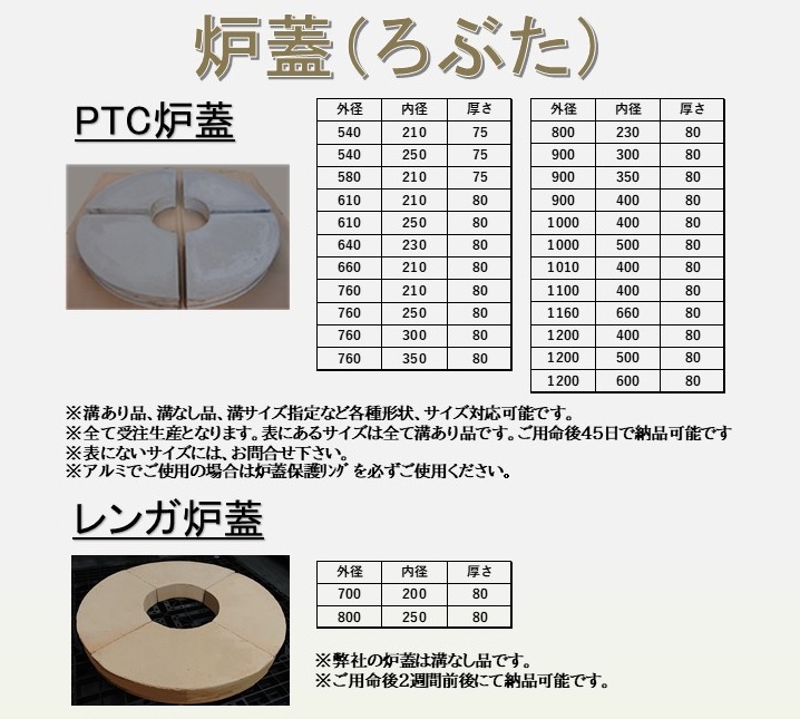 ※鉄炉蓋、鉄枠キャスタブル炉蓋など、他のラインナップもあります。